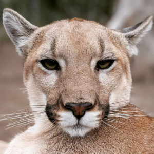 Larger than some “big” cats, the Puma – also known as panther (Florida), mountain lion or cougar – is probably more related to smaller cats. Most of its fur is uniformly colored, ranging from light grey through tawny-brown to brick-red, with creamy white underparts. Tail tip and backs of ears are dark brown to black, and the white muzzle is bordered by black. The tail of the Puma is long, distinctive, and tubular. Cubs have rich dark brown spots that usually fade within the first year. The Puma has long muscular rear legs for powerful leaping and very large paws relative to its overall size. It makes many sounds, including an eerily humanlike scream when courting, can purr, but it cannot roar.