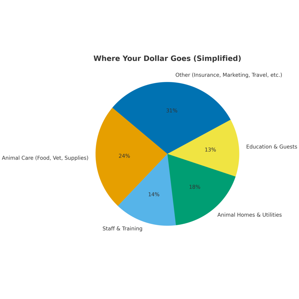 Every single dollar is stretched to meet the daily needs of more than 40 animals in our care. Hereās how it breaks down: