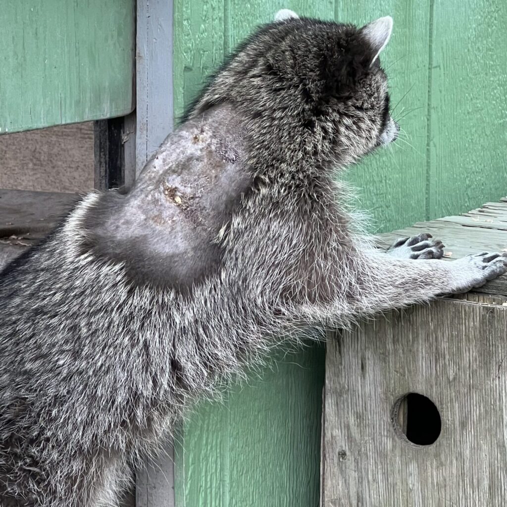 In Washington state, it is illegal to possess wild animals, and raccoons, in particular, are often subject to euthanasia by WDFW due to the risks associated with their habituation to humans. Billy was in a tree when WDFW arrived, delaying his confiscation until the following day. During this critical window, Cat Tales was contacted. With WDFW’s permission, Billy was brought to our facility for the care he desperately needed.